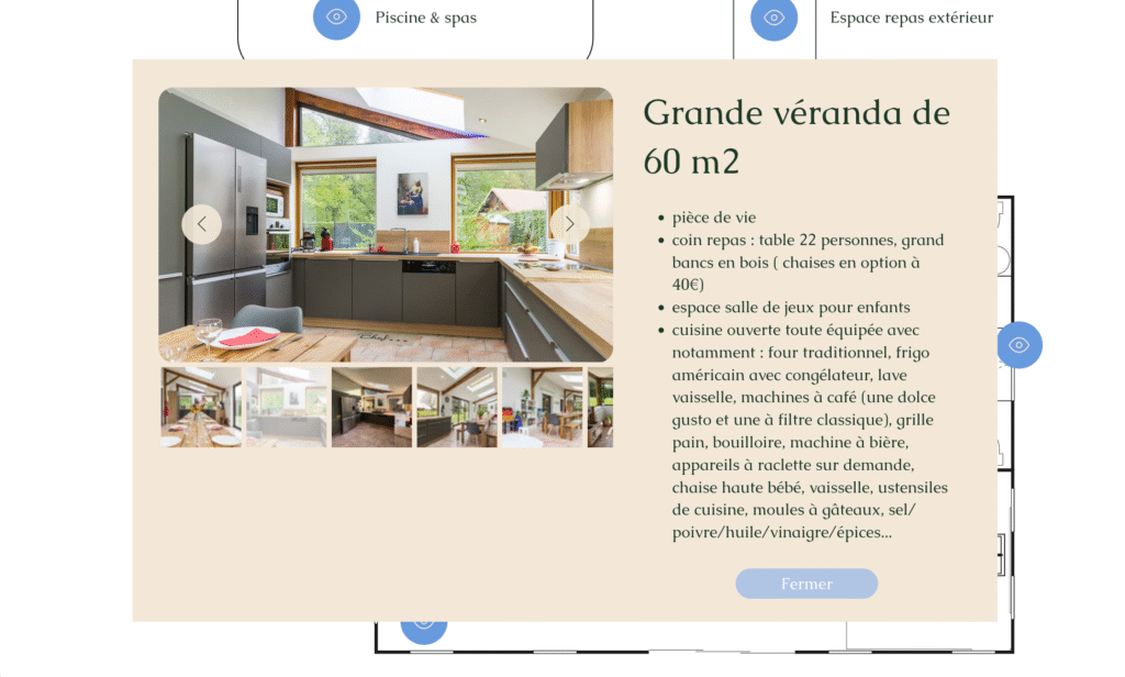 un plan du lieu sur lequel les visiteurs peuvent cliquer pour découvrir chaque espace — chambres, salon, jardin, cuisine…
